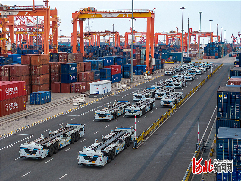 近日,唐山港京唐港区,集装箱码头堆场上智能平板运输车整装待发。 河北日报记者赵杰摄